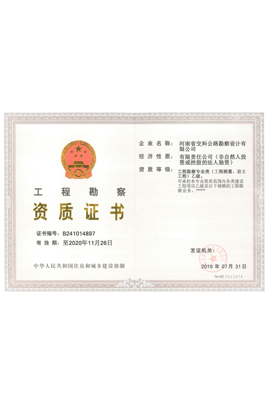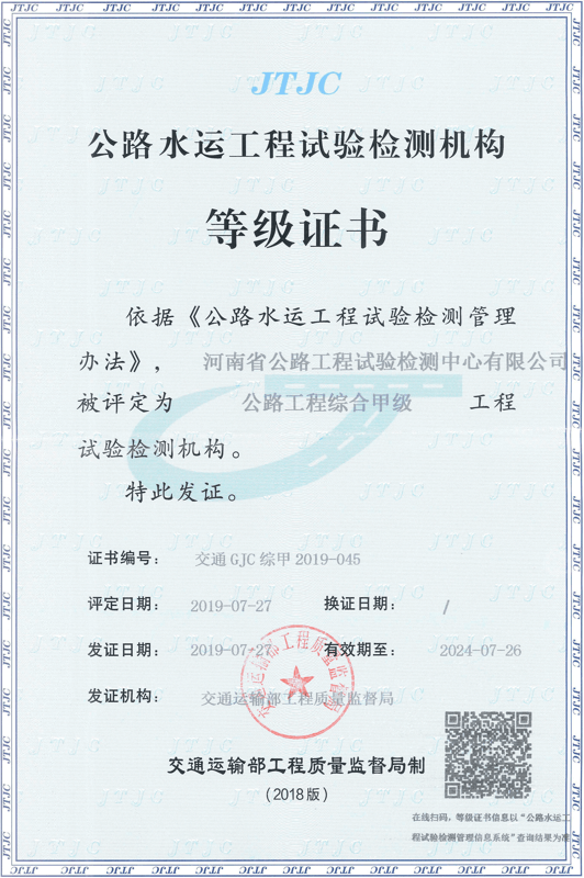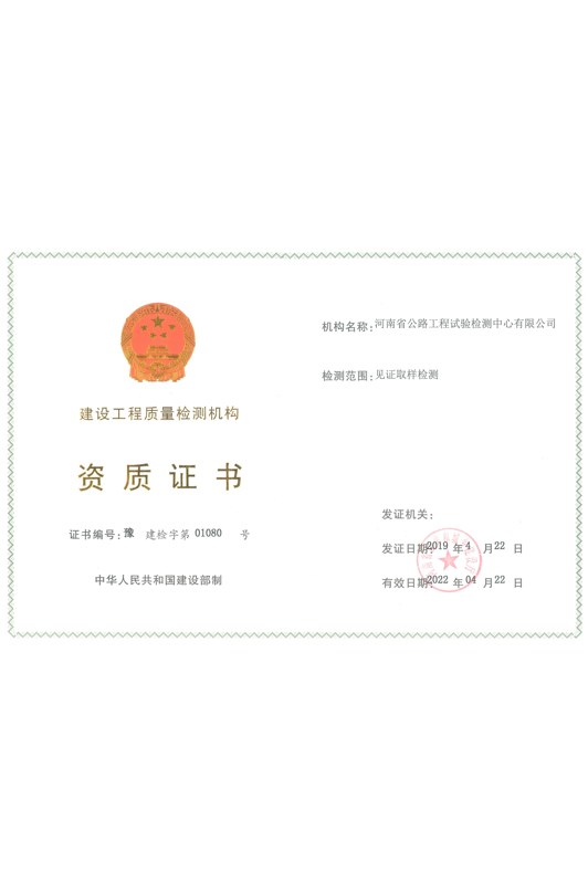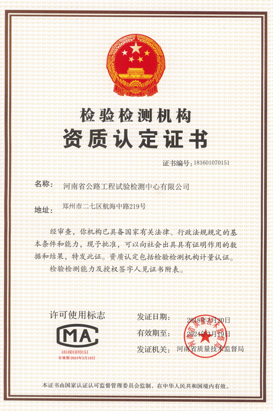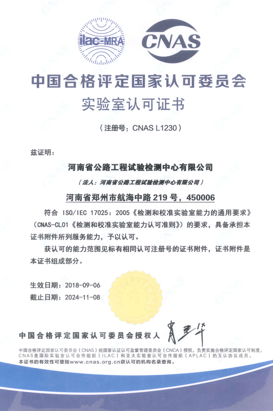 公司自成立以來,己先后通過實(shí)驗(yàn)室計(jì)量資質(zhì)認(rèn)定、交通運(yùn)輸部公路工程綜合甲級試驗(yàn)資質(zhì)以及國家實(shí)驗(yàn)室認(rèn)可。1996年5月通過河南省質(zhì)量技術(shù)監(jiān)督局計(jì)量認(rèn)證初次評審;2000年5月通過交通運(yùn)輸部公路工程甲級試驗(yàn)資質(zhì)審核;2004年3月通過國家實(shí)驗(yàn)室認(rèn)可初次評審;2007年8月通過交通運(yùn)輸部公路工程綜合甲級試驗(yàn)資質(zhì)審核;2016年3月獲得河南省住建廳頒發(fā)的見證取樣資質(zhì)。