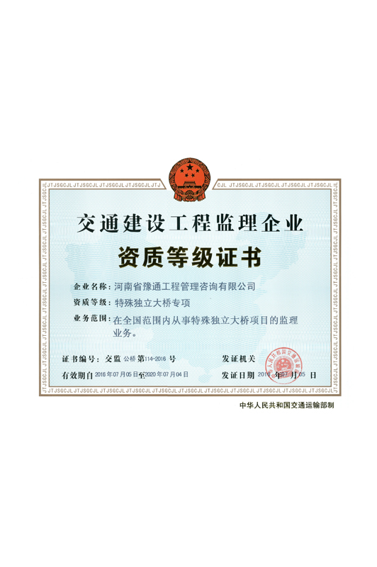 交通建設(shè)工程監(jiān)理特殊獨(dú)立大橋?qū)m?xiàng)等級證書 -
