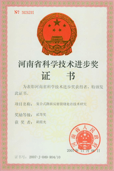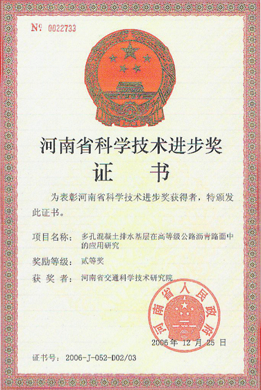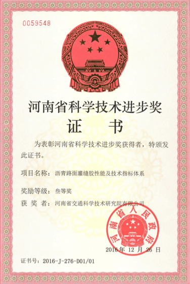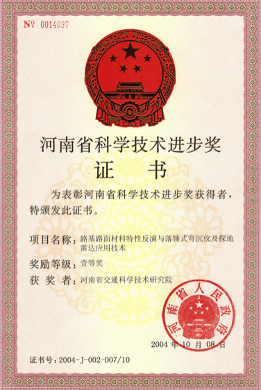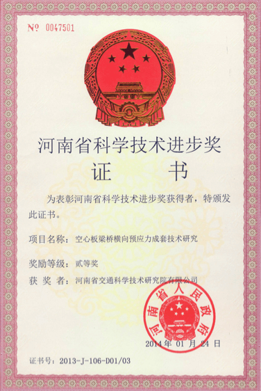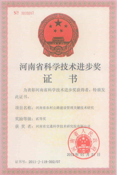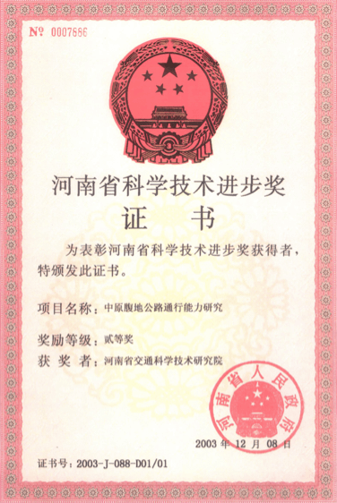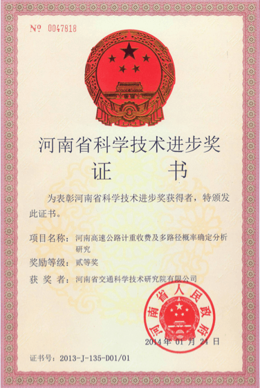 2003以來,公司科研項(xiàng)目獲得各項(xiàng)獎(jiǎng)勵(lì)114項(xiàng)。其中,河南省科技進(jìn)步一等獎(jiǎng)1項(xiàng),二等獎(jiǎng)10項(xiàng),三等獎(jiǎng)8項(xiàng);河南省交通運(yùn)輸科學(xué)技術(shù)進(jìn)步一等獎(jiǎng)31項(xiàng),二等獎(jiǎng)44項(xiàng),三等獎(jiǎng)10項(xiàng);獲得河南省優(yōu)秀工程咨詢成果一等獎(jiǎng)4項(xiàng);鄭州市學(xué)術(shù)創(chuàng)新成果展三等獎(jiǎng)1項(xiàng);中國公路學(xué)會(huì)科學(xué)技術(shù)二等獎(jiǎng)1項(xiàng),三等獎(jiǎng)2項(xiàng);科學(xué)技術(shù)普及成果一等獎(jiǎng)1項(xiàng);中國交通運(yùn)輸協(xié)會(huì)科學(xué)技術(shù)獎(jiǎng)1項(xiàng)。